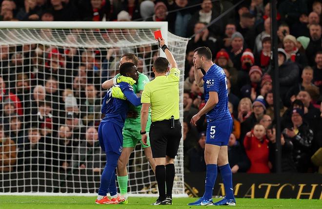 上半场前15分钟的时间,比赛波澜不惊;而第16分钟却发生了一件哭笑不得的事情。在曼联的一次进攻结束后,盖伊对队友迈克尔-基恩的表现有所不满,并发生了语言上的冲突;在这个过程当中他甚至还打了队友一巴掌,这个动作被恰好被主裁判看个正着,并当即向他出示了红牌。盖伊在被裁判出示红牌之后显得更加暴躁,这也迫使恩迪亚耶和皮克福德不得不轮番上来对他进行安抚;盖伊之后才正式退场。